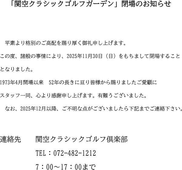 | 2025/06/05 | ・2025年5月31日をもって、コース売店終了のため、 飲み物はスタート前にフロントにてお買い求めください。 |